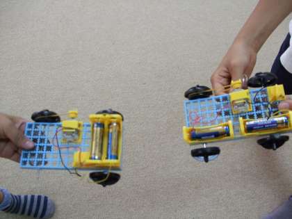 電池で動く車を走らせてレースをしていました。電池のつなぎ方で速さが変わります。誰の車が一番速いでしょうか、レースで順位を決めましょう!