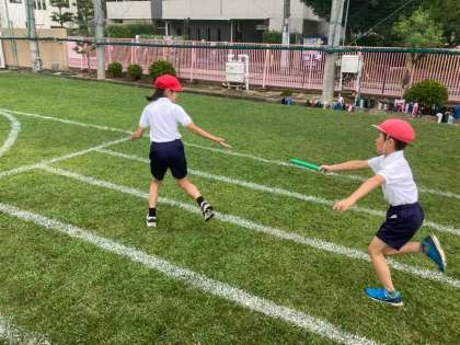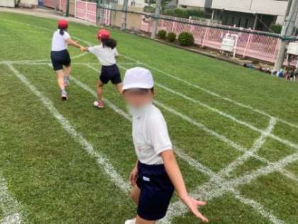 今日の体育では、リレーのバトンの受け渡しの声掛けやタイミングの練習をしました。
