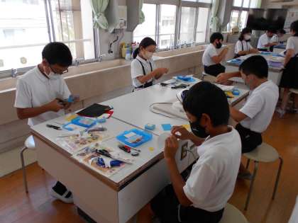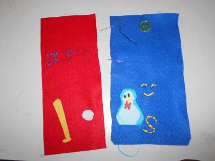 2色の色のフェルトを組み合わせ、コースター、ティッシュケース、お財布、ペンケースなどを作っています。今日は、アイロンの使い方を学び、作っている小物にアプリッケをつけました。完成した作品は、廊下に展示しています。