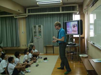 ライアン先生の自己紹介を楽しそうに聞いています。