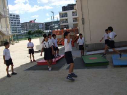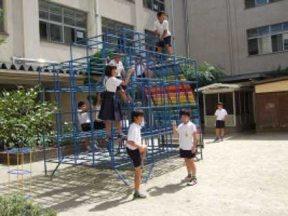 「ジャングルジム鬼ごっこ」をして元気に走り回っています。