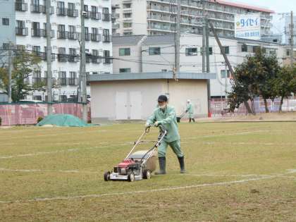 本日は、城東区の管理作業員さんたちにより、芝生作業を行いました。