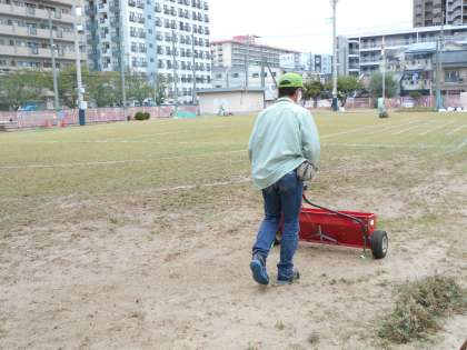 とはいえ、広い運動場ですので、城東区内の管理作業員さんや前任の管理作業員のご協力をいただきながら、11日(火)のオーバーシードに向けた作業をしていただいています。