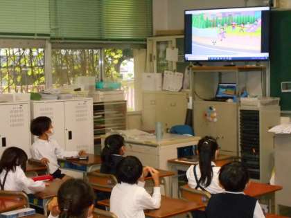 今週、1年生は交通安全指導のビデオを見て、日常生活の中でおこりうる危険な場面について、クイズ形式で学習しました。