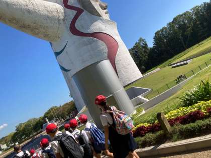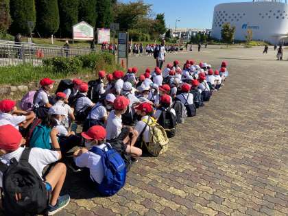 太陽の塔を間近で見て、子どもたちはその大きさに驚いています。