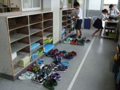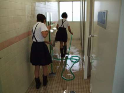 夏休みに向けて机を廊下に出して教室の大掃除やトイレ
