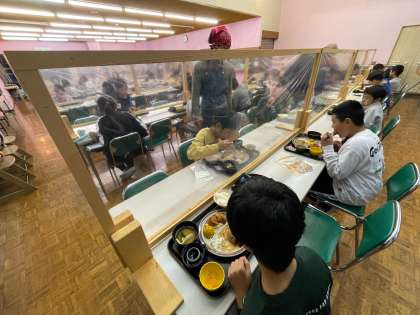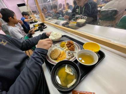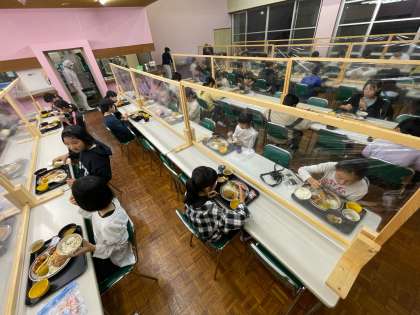 少し早い時間ですが、2組の半分と3組が食事をしました。配膳は食事係を中心に、衛生面に気をつけて行いました。たくさん活動したので、おかわりがすごい!!キャンプファイヤーに向けて体力も万全です!!