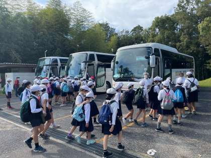 予定通り14時に宿舎を出発しました。バス到着は15時頃を予定しています。