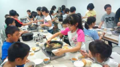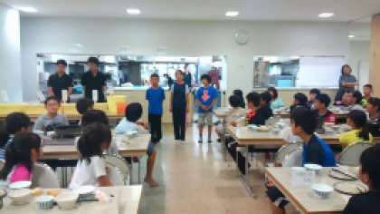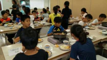 メニューは、子どもたちが大好きな“すき焼き”です。夕食後の活動に備えてまだお風呂に入っていないので、昼間に流した汗の上にさらに汗をかきながら、一生懸命箸を動かしています。