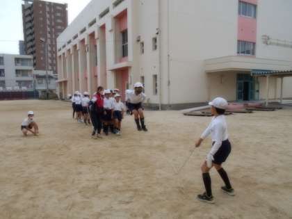 縄跳びでは、大繩では縄の動きをよく見て、タイミングよく跳びました。一瞬の集中力とチャレンジする気持ちが表れました。みんなで「がんばれ!」と声をかけ合いながら楽しんでいました。