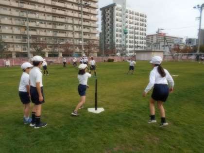 Tボールは、ホームベースにT(ティー)を立て、そこにボールを置いて手で打つハンドベースボールです。どこに打つのかねらいを定め、そのあとは一気にベースを駆け回ります。チーム対抗で競い合いながら楽しむ姿が見られました。