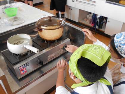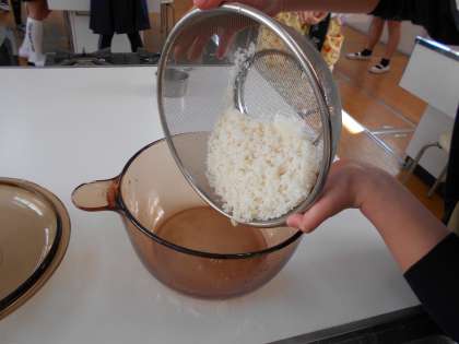 「ご飯」は、お米をとぎ、人数分の水を入れ、中が見える透明なガラス鍋で、火加減に気をつけながらガスで炊きました。