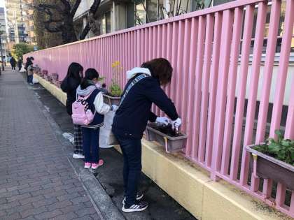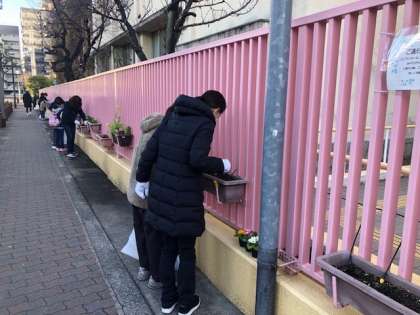 21日(土)、PTA学級委員会のみなさまが、本校玄関前のプランターへパンジーの花を移植してくださいました。