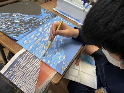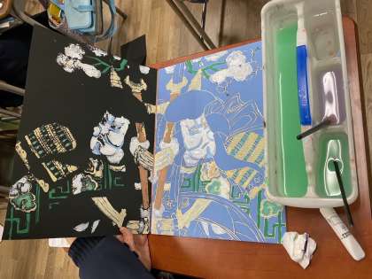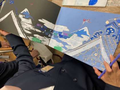彫った木の板に見本を見ながら、丁寧に絵の具で色をぬり、黒い画用紙に張り合わせて刷りました。