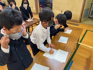 写真はアイマスクをしながら、文字や絵を書いている様子です。