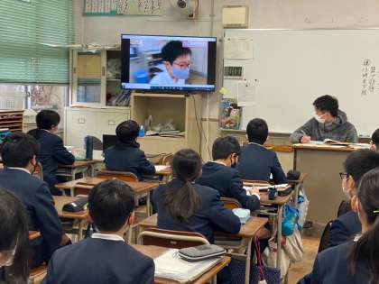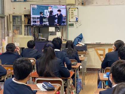委員会の子たちが出演し、作成した動画を教室で見ました。