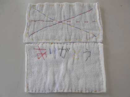 雑巾はタオルを折り、手縫いして作ります。「糸の色を工夫する」や「縫い方で模様を作る」、「文字を入れる」、「刺繍する」など様々な工夫をして、感謝の気持ちを表現しました。