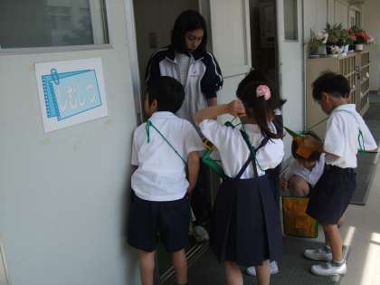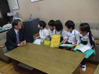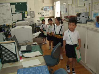 今1年生が、学校たんけんをしています。「失礼します。1年2組の○班です。職員室を見せてください。」かわいい声でごあいさつ。校長室にも入れていただいていろいろ質問もしています。