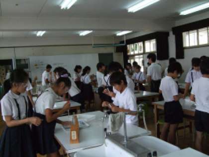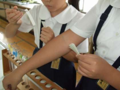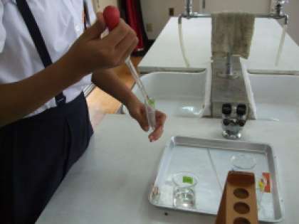 薬品や器具を正しく使うために、安全めがねをかけてリトマス紙や