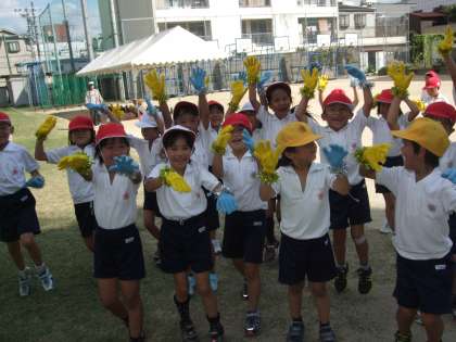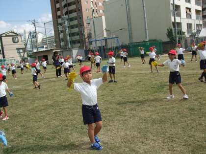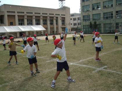 1年生が、運動場で運動会の練習をしています。