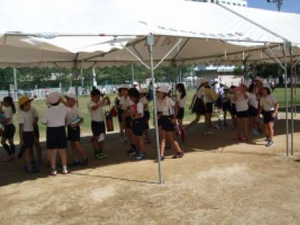 また運動会の練習が終わった学年は、テントの下でお茶を飲み体を