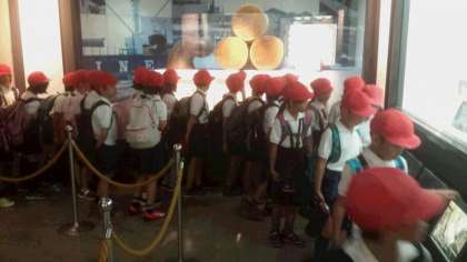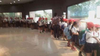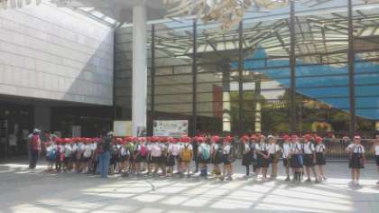 関目小と同じように見学を午後に変更した学校が多数あるそうで、本来は自由に見学させる予定でしたが、並んで移動することになりました。