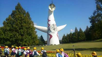 到着した子どもたちを太陽の塔が出迎えてくれました。
