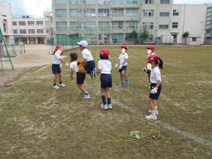 サツマイモの長いツルを使って、なわとびをして遊んでいる子ども達もいました。