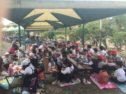 午前中、ワクワクしながらたくさんの動物を見て回ったので、結構お腹も空いてきた頃に、お楽しみのお弁当タイムが始まりました。保護者の方の愛情と、友だちと食べる楽しさが合い重なって、いつも以上に美味しく感じながら、どんどん箸が進んでいたようです。