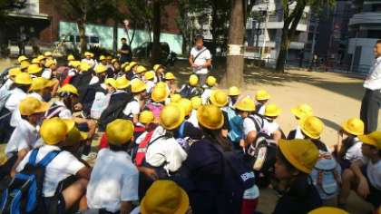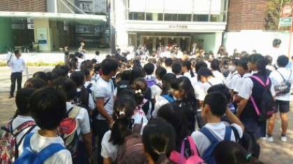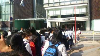 午後の部の鑑賞だったので、学校でお弁当を食べてから電車で現地に向かいました。現地に着くと、劇場手前の公園で係の人から説明を聞き、館内に入場しました。