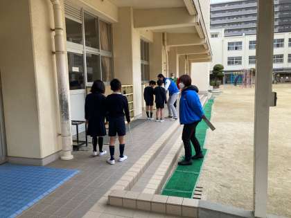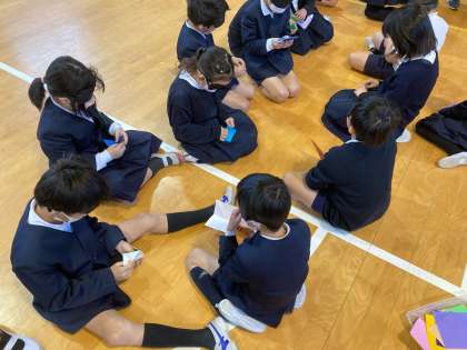目の見えない人の気持ちになって学校を歩く体験をしました。いつも通っている道でも、見えないだけでとても不安そうに歩いていました。そんなお友だちのために、一生懸命介助する姿も見られました。