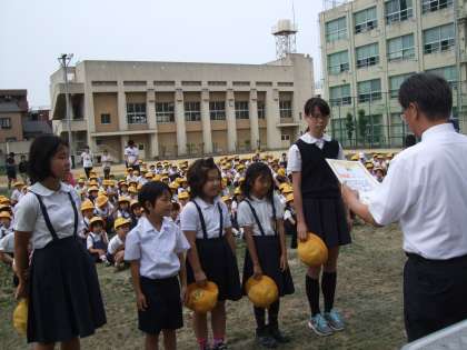 24日の全校遠足オリエンテーリングの優勝・準優勝チームの表彰が行われました。回ったポイント数・ポイントでの得点・オリエンテーリングにかかった時間を総合して決定しました。優勝は、2班いチームで、準優勝は、9班れチームでした。おめでとうございます(^0^)・/