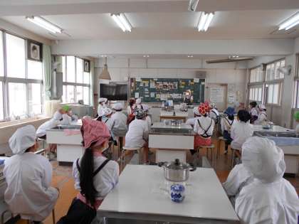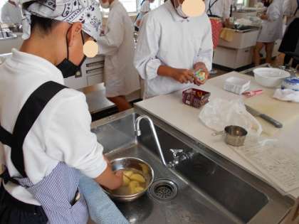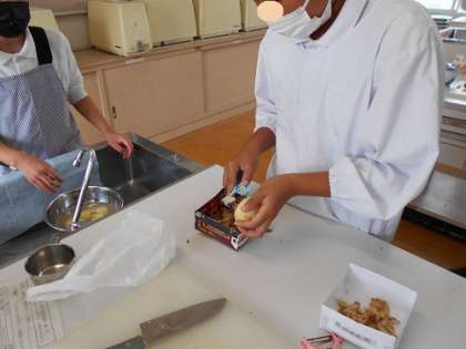 最初の調理実習なので、調理するときの身支度、材料・用具の準備・使い方、調理の流れ・ポイントなど基礎的なことを学習していきます。