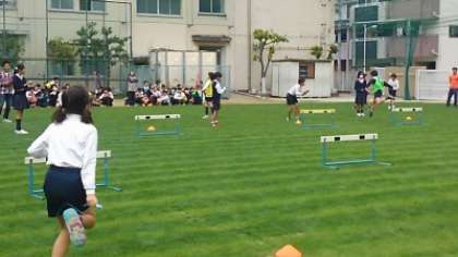 運動場に集まった大勢の友だちの応援を受けて、各チーム