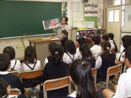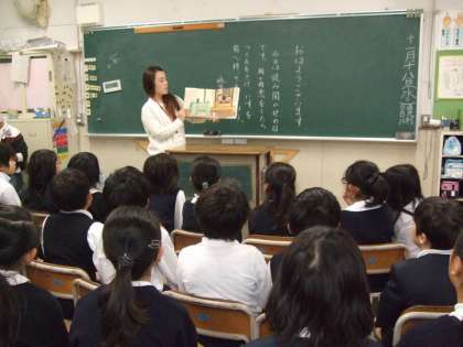 朝の放送が流れると机を後ろに下げ、どの学級もお話を聞く隊形を整えて
