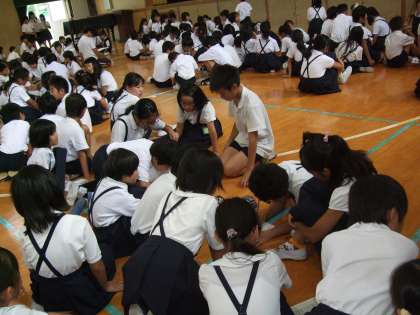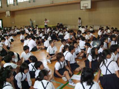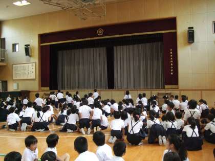 舞台のカーテンの隙間を飛ぶ物を当てるクイズです。