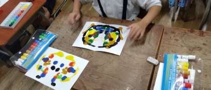 2年生は、図画工作科で初めて絵の具を使いました。 「デカルコマニー」をしました。 画用紙半分に絵の具をのせて重ねておると、不思議な模様ができました。