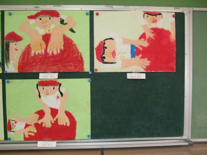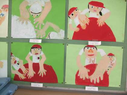 2年生の教室をのぞくと、運動会の大玉ころがしの絵が掲示されています。