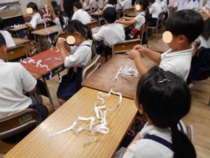 指先を器用に使って、紙を細く長くちぎる練習をしていました。