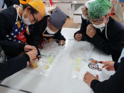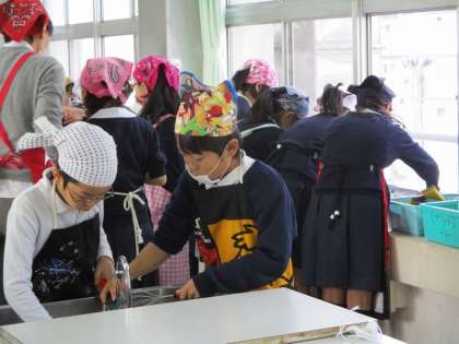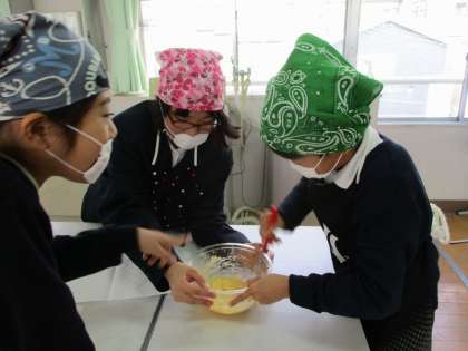 出来上がった手作りのマヨネーズは、きゅうりにつけておいしくいただきました。また片付けも、班で協力して手際よくできていました。マヨネーズができた時は「おーっ。」と感動の声があがっていました。