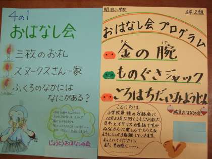 今月の23日(水)にお話会があります。城東おはなしの会の方が子どもたちのために楽しい本を用意してくださっています。各クラス手作りの素敵なポスターも届いています。もうすぐ教室に掲示される予定です。楽しみにしていてほしいと思います♪