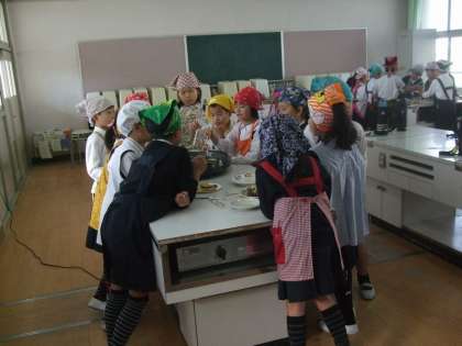 エプロン姿の2年生が、ホットプレートを囲んでいます。