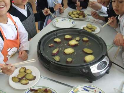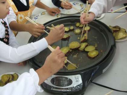 学習園で育てたサツマイモをゆがき、バターをひいてこんがりと