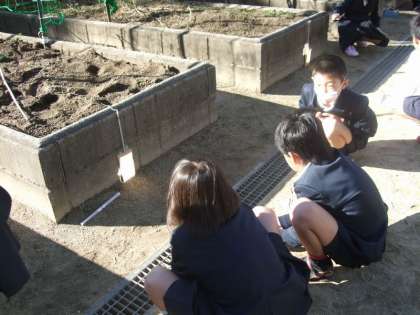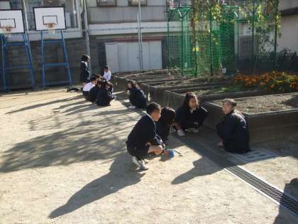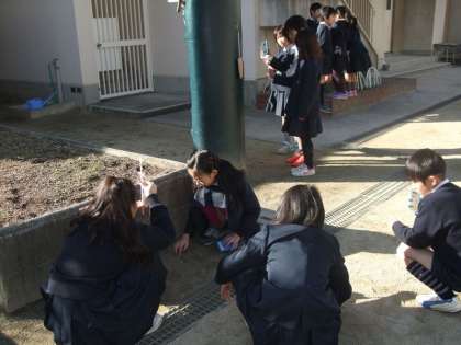 鏡ではね返った日光をダンボール紙に当てて、明るさと温かさを調べる