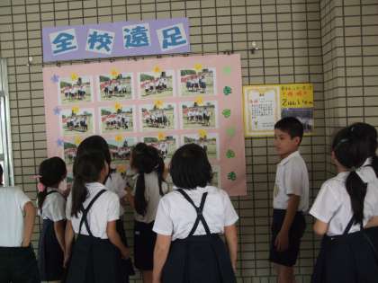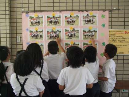 24日の全校遠足で撮影したグループ写真を玄関に張り出しました。1班から16班の「ふ・れ・あ・い」のグループ別に撮影しています。早速子どもたちは、友達や自分のグループ写真を見つけて大喜び(^−^)