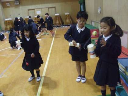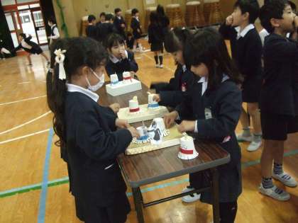 2年生が手作りしたおもちゃを集めてパーティーを開き、1年生を