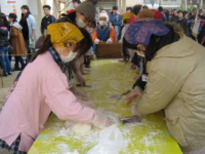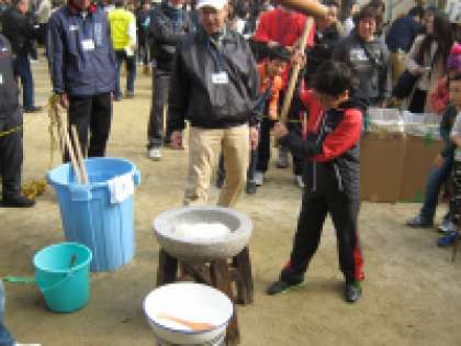 大人は力強くつき、子どもは慣れない重い杵にふらつきながらも、一生懸命ついています。