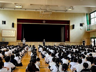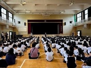 写真は訓練のあと、講堂に集まり防犯に関する大切なお話をしていただいているところです。
