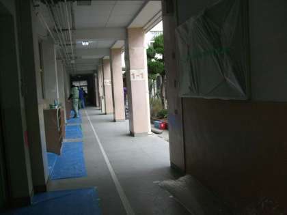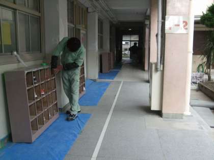 1年生の教室前廊下の壁面塗装が始まりました。