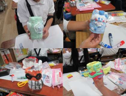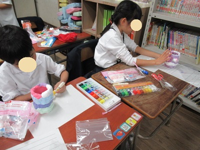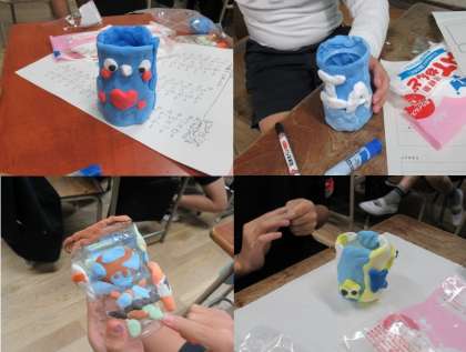 ペットボトルに粘土を貼ってペン立てを作っていました。